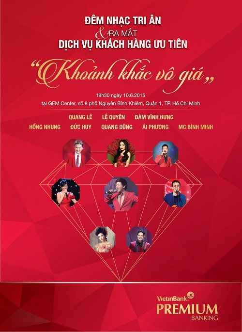 Cam kết luôn mang đến những sản phẩm, dịch vụ tốt nhất, VietinBank đồng thời mong muốn mang đến cho các khách hàng ưu tiên những giá trị khác biệt, tinh tế và đẳng cấp. Đêm nhạc tri ân chủ đề “Khoảnh khắc vô giá”, được đầu tư công phu với ekip sản xuất hàng đầu Việt Nam, là một trong những đặc quyền khách hàng được tận hưởng khi sử dụng và trải nghiệm dịch vụ VietinBank Premium Banking. Sẽ còn nhiều hơn thế khi khách hàng là người trực tiếp khai mở những bất ngờ tại GEM Center (TP. HCM) vào ngày 10/6/2015.
