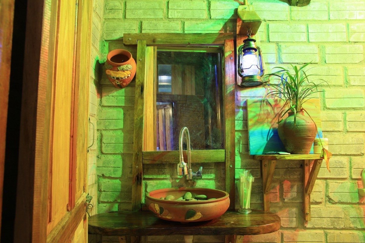 Không gian nhà vệ sinh cũng rất độc đáo khi sử dụng chủ yếu các chất liệu bằng tre, trúc, gốm... tạo không gian gần gũi và ấm cúng.