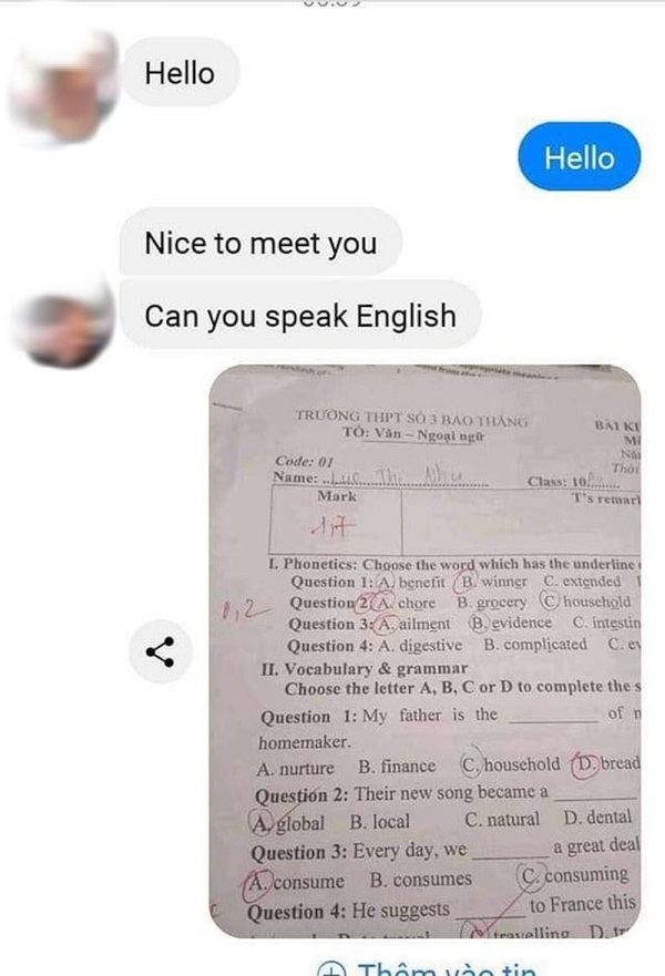 Theo đó, khi một chàng trai ngoại quốc bắt chuyện "hello" (Xin chào) thì cô nữ sinh cũng nhiệt tình đáp "hello" lại. Tưởng gặp được người biết nói tiếng Anh, chàng trai hào hứng hỏi thêm: "Nice to meet you. Can you speak English" (Rất vui được gặp bạn. Bạn biết nói tiếng Anh không?) thì cô nàng này lại phũ phàng gửi 1 bài kiểm tra Tiếng Anh chỉ vỏn vẹn 1,7 điểm.