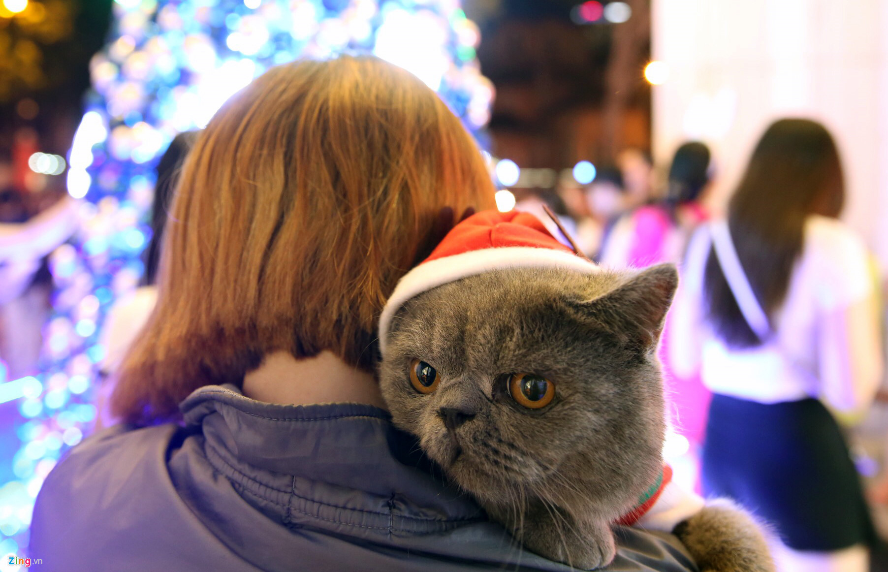 Một cô gái cho chú thú cưng đội mũ đỏ ra phố chơi. Ảnh: Zing.vn |