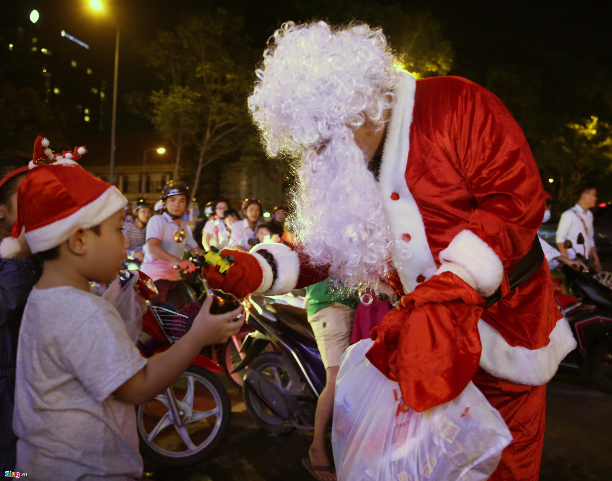 Phương Như và Thanh Tâm (ngụ quận Bình Thạnh, Tp. Hồ Chí Minh) cho biết cậu đã mặc trang phục ông già Noel và ra đường từ 18h30. Ảnh: Zing.vn |