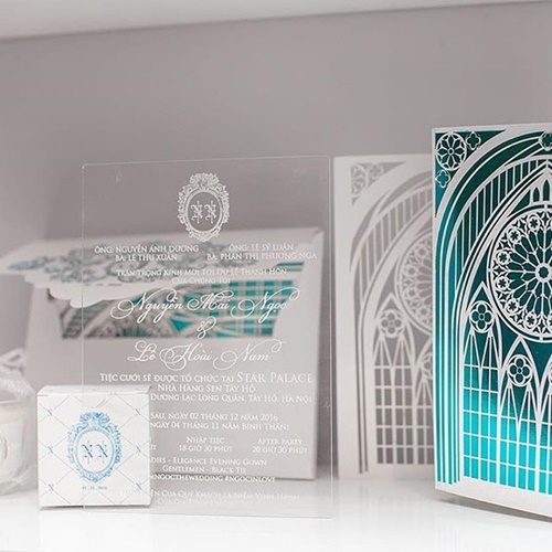 | Thiệp cưới của cặp đôi được thiết kế rất tinh xảo, cầu kỳ. |