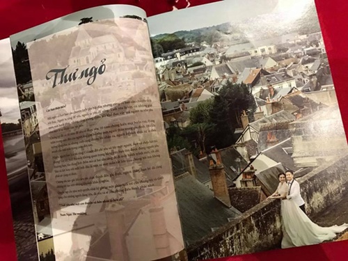 | Vợ chồng Mai Ngọc cũng gửi tặng đến các khách mời món quà là cuốn album ảnh cưới nhỏ được thiết kế như một cuốn tạp chí. |