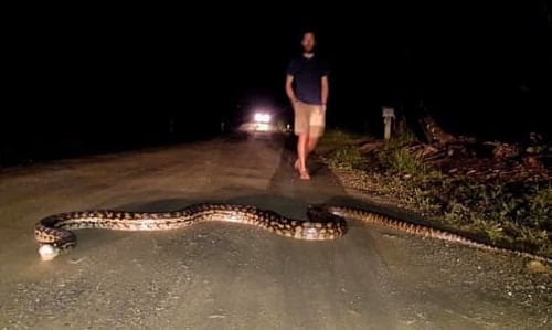 Con trăn dài 7 mét nằm trải dài toàn bộ chiều dài trên con đường trong khu rừng nhiệt đới Daintree, phía đông bắc bang Queensland, Australia khiến các du khách một phen hú vía.
