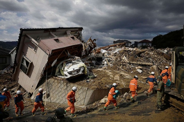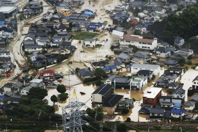 Đây là trận mưa rào lớn nhất ở Nhật Bản trong vài thập kỷ trở lại đây, khiến lũ quét và sạt lở đất xảy ra. Nhiều xe cộ đã bị lũ cuốn trôi và rất nhiều người đang phải trú mưa dưới căn nhà đã bị ngập úng của mình.