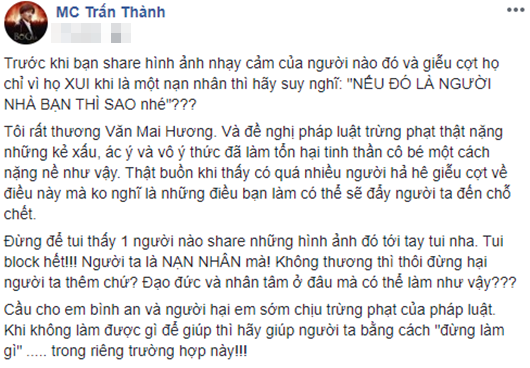Trấn Thành viết: "Trước khi bạn share hình ảnh nhạy cảm của người nào đó và giễu cợt họ chỉ vì họ xui khi là một nạn nhân thì hãy suy nghĩ: "Nếu đó là người nhà bạn thì sao nhé"???