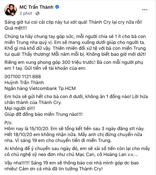 "Nay đọc về miền Trung và những câu chuyện thương tâm thấy xót quá! Thành Cry lại cry nữa rồi! Quá mệt! Chúng ta hãy chung tay góp sức, mỗi người chia sẻ 1 ít cho bà con miền Trung nha quý vị. Em sẽ mang xuống dưới giúp cho người ta. Khổ gì mà khổ dữ vậy. Thiên nhiên đối xử tệ với bà con miền Trung tôi quá! Thấy thương! Mỗi năm mỗi bị. Không biết bao giờ mới dứt! Riêng em xung phong góp 300 triệu trước! Bà con mỗi người phụ em 1 tay", Trấn Thành viết trên trang cá nhân.