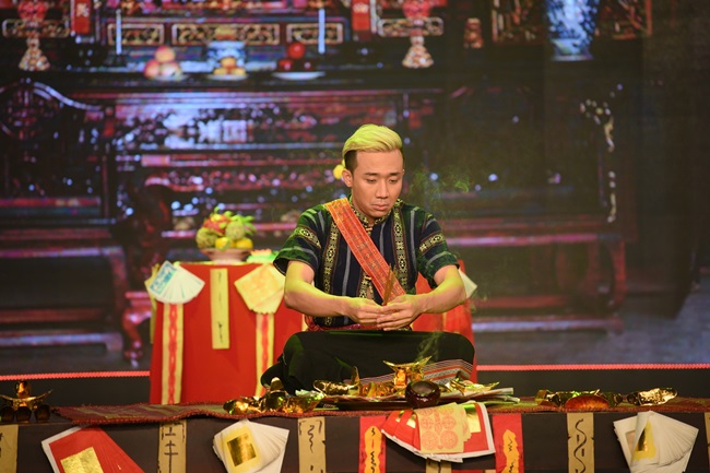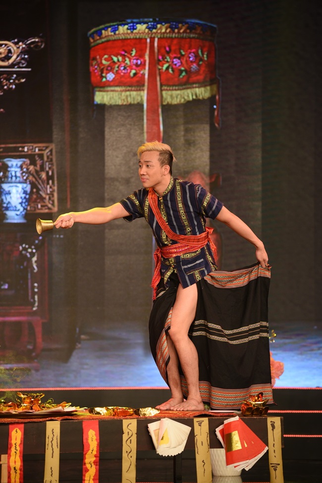Trang phục của nhân vật của Chí Phổi cũng khá độc đáo với váy thổ cẩm xẻ tà. Tuy giả gái cũng nhiều nhưng có lẽ đây là lần đầu tiên Trấn Thành mặc đồ độc như vậy.