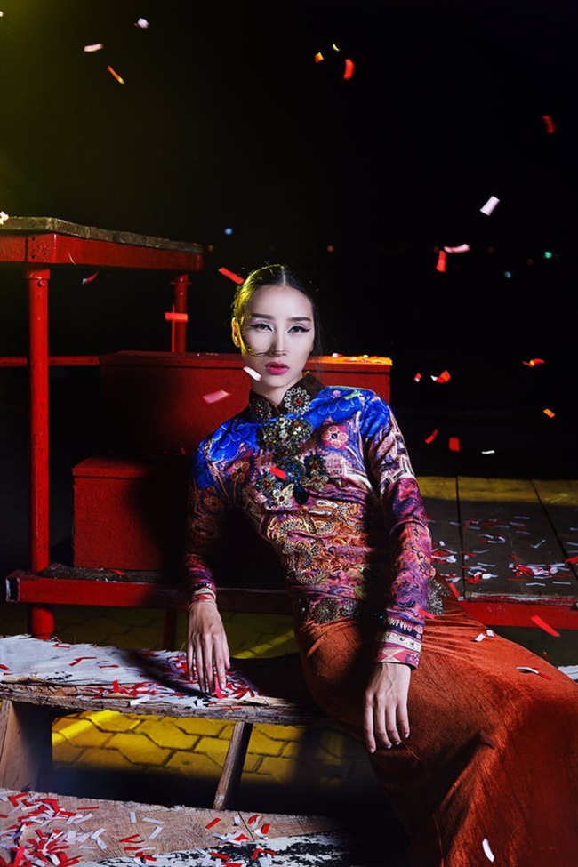 Bộ ảnh mới của Trang Khiếu được thực hiện đúng mùa trung thu. Cô diện áo dài có họa tiết, màu sắc bắt mắt. |
