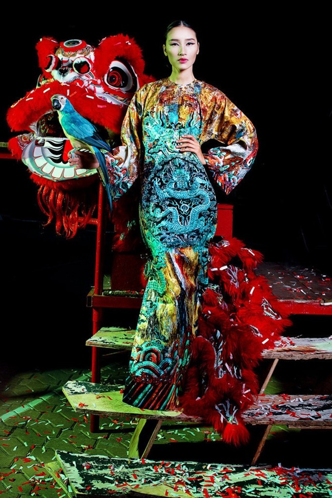 Họa tiết và sắc màu trong những bộ áo dài cách điệu Trang Khiếu diện tiệp màu cùng "bạn diễn" đặc biệt. |