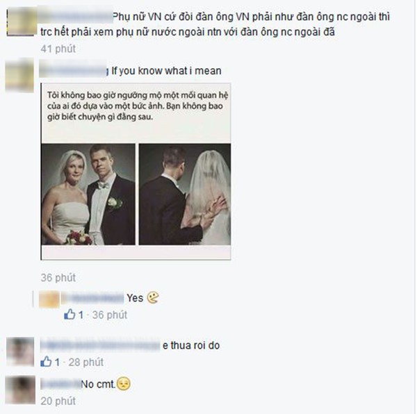 Nick Tâm Đặng cho rằng: “Đàn ông Tây hơn đàn ông Việt ở cách cư xử và lời nói đối với phụ nữ . Bởi thế bọn con trai bây giờ đừng bao giờ mở miệng bảo con gái hám chồng Tây nha!”. Facebooker Đào Hồng cũng tỏ ra tâm đắc với những so sánh đàn ông Tây - đàn ông Việt: “Chuẩn luôn! Mình cũng gặp qua bao nhiêu đôi đi mua chăn ga gối cho hôm cưới, vợ thì hào hứng các kiểu, chồng thì ngoảnh mặt làm ngơ, hỏi thì cứ ừ ừ xong tiếp tục công việc, trả lời cho có, mình thích như nào thì kệ mình. Chán luôn! Thế thà đi một mình cho nhanh, dắt thêm của nợ mua bực vào người”.