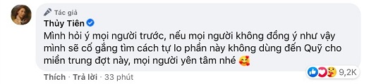 Hiện tại, các bài đăng của Thủy Tiên liên quan đến việc xin trích quỹ cứu trợ miền Trung để hỗ trợ người lao động Việt đã được xóa khỏi trang fanpage của nữ oa sĩ.