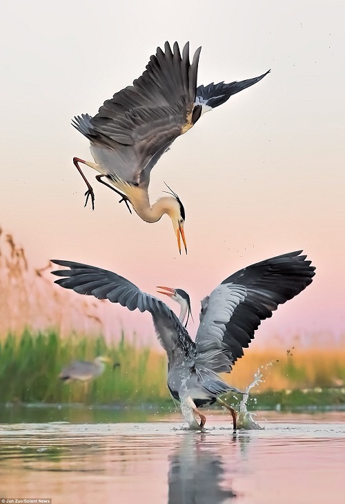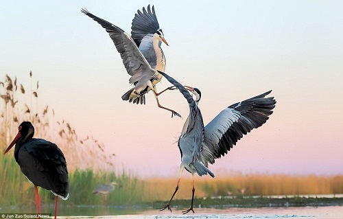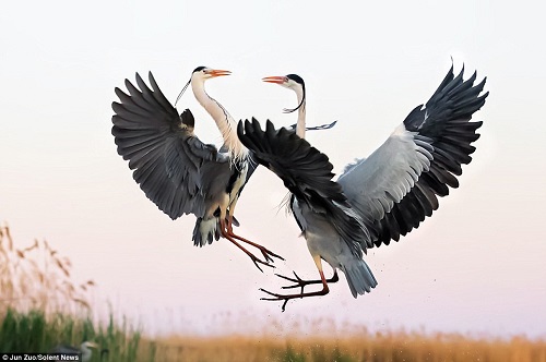 Hai chú diệc xanh đánh nhau lúc bình minh. Ảnh: Jun Zuo |