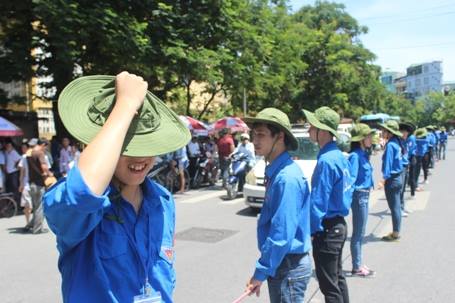Trong kỳ thi THPT quốc gia 2015, để giúp các thí sinh đến điểm thi thuận lơi, hàng trăm sinh viên tình nguyện (SVTN) đã phơi mình dưới nắng nóng 40 độ lập "hàng rào sống" phân luồng giao thông.