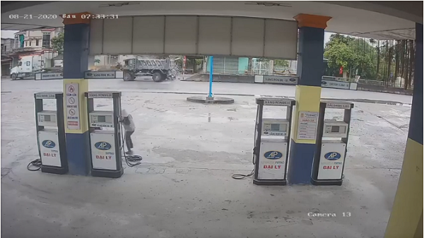 Xe tải trôi tự do vào trạm xăng sau va chạm nhưng may mắn dừng lại kịp thời. Ảnh cắt từ video. |
