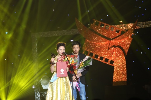Trương Ngọc Ánh (váy trắng) nhận giải Nữ diễn viên xuất sắc nhất và diễn viên Mai Thu Huyền nhận thay Trung Dũng nhận Giải Nam diễn viên xuất sắc nhất. Trao giải là Ngô Thanh Vân và Trần Bảo Sơn. |