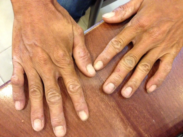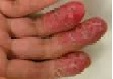 Chị Mai Thị Ngoan cho biết : "Sau thời gian dài phải dùng găng tay cao su; sau đó xuất hiện những nốt rịn nước; rồi dần nứt và khô các đầu ngón tay; chị phát hoảng đi khám rồi bôi thuốc tây cứ đỡ lại tái phát; có đợt đau nứt kinh khủng, chảy máu, từng lớp da một cứ bong tróc, nhiều đêm không ngủ mà thấy đôi bàn tay trông thật tệ".