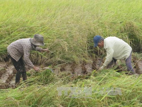 Thu hoạch lúa mùa sớm để tránh bão số 7 tại Nam Định. Ảnh: Nguyễn Lành/TTXVN |