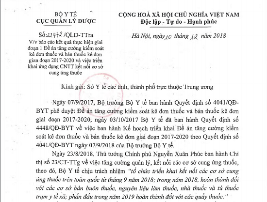 Ngày 10/12/2018 Cục Quản lý Dược ra Công văn số 22472/QLD-TTra về việc báo cáo kết quả thực hiện giai đoạn 1 đề án tăng cường kiểm soát kê đơn thuốc và bán thuốc kê đơn từ 2017-2020 và việc triển khai ứng dụng CNTT kết nối cơ sở cung ứng thuốc.