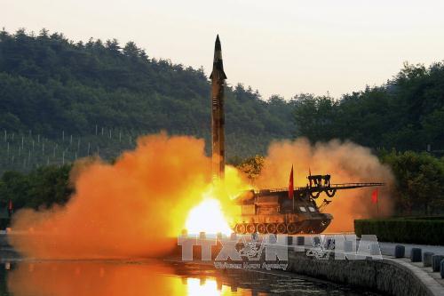 Triều Tiên phóng thử một tên lửa đạn đạo được trang bị hệ thống dẫn đường chính xác tại một địa điểm bí mật ở Triều Tiên. Ảnh: EPA/TTXVN |