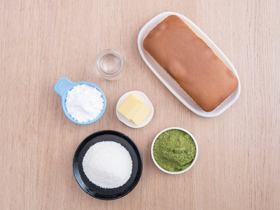 Rây đường xay và bột trà xanh matcha vào âu, tiếp đến cho bơ đun chảy vào trộn đều bằng phới lồng. Sau đó thêm nước nóng từ từ vào, khuấy đều cho đến khi bột mịn đặc thì dừng không thêm nước nữa.