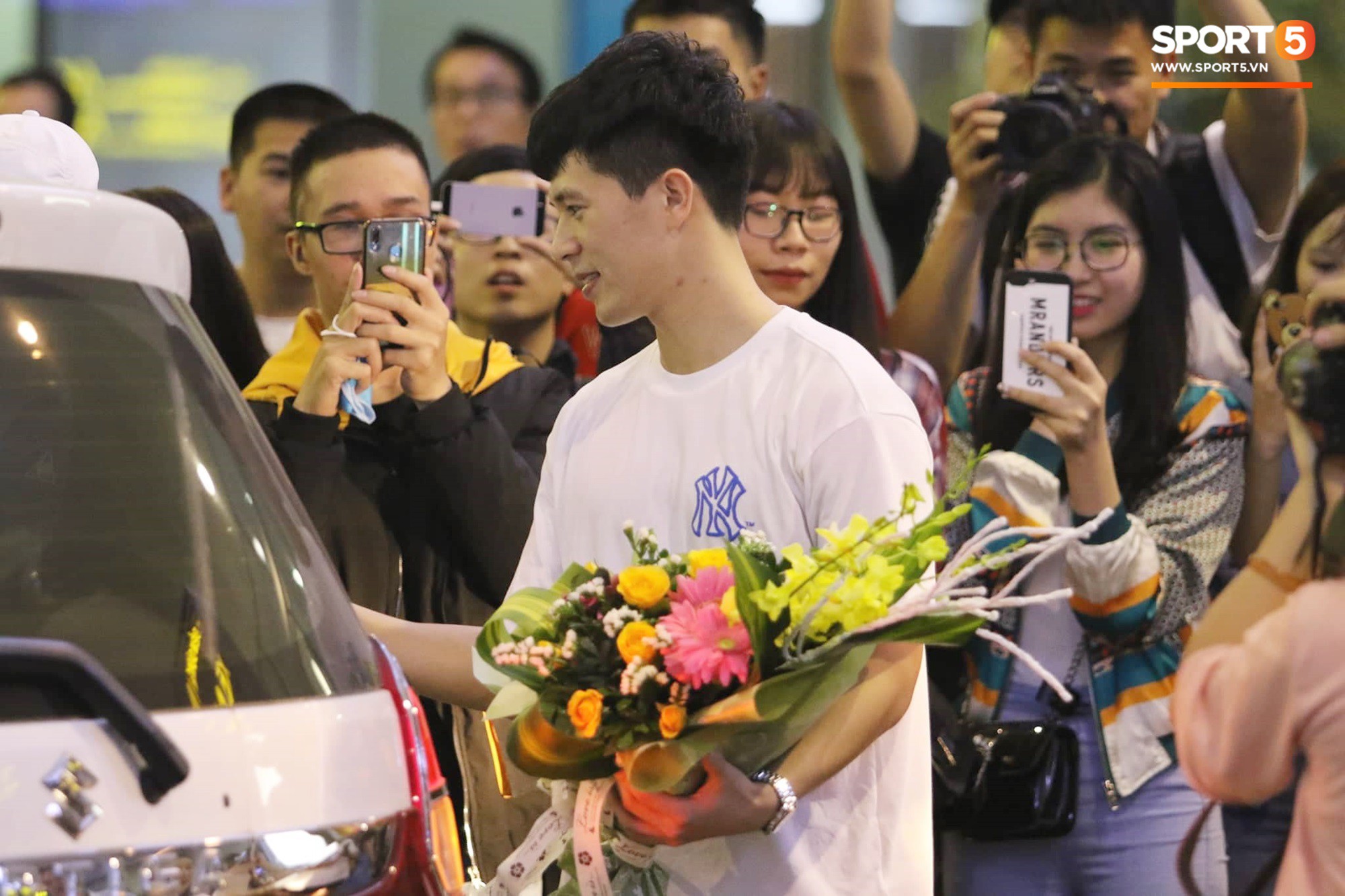 Đúng 21h tối ngày 5/3, chuyến bay đưa Đình Trọng trở về Việt Nam đã tới Hà Nội. Mặc dù đã muộn nhưng vẫn có rất nhiều người hâm mộ tới sân bay Nội Bài chờ đón anh chàng này.