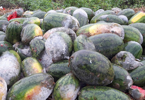| Dưa bị hư hỏng nằm chất đống ở đầu bờ ruộng. Ảnh: Hải Bình. |