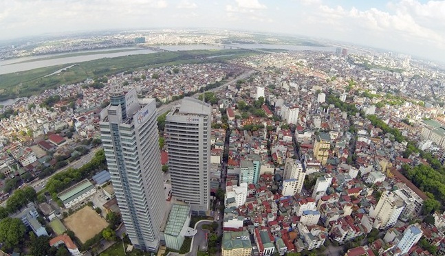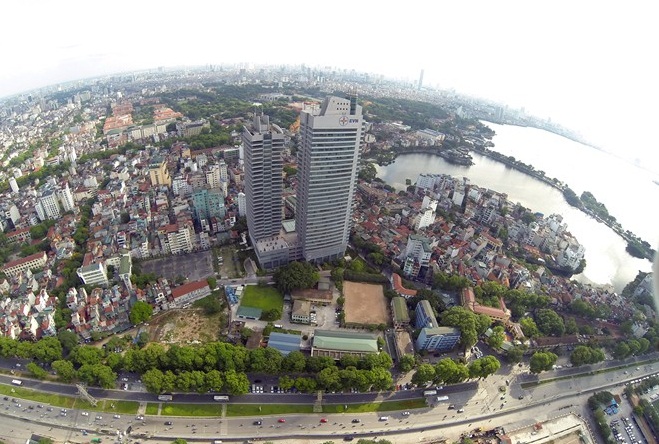 | Nhìn từ trên cao, trụ sở của EVN trông nổi bật, đồ sộ hơn hẳn so với những tòa nhà bên cạnh. |