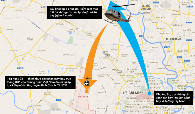 Thông tin trên Báo điện tử Chính phủ cho biết, chiếc trực thăng quân sự UH1 xuất phát tại sân bay Tân Sơn Nhất vào lúc 7 giờ 15 phút và mất tín hiệu liên lạc với mặt đất vào lúc 7 giờ 23 phút ngày 28/1.
