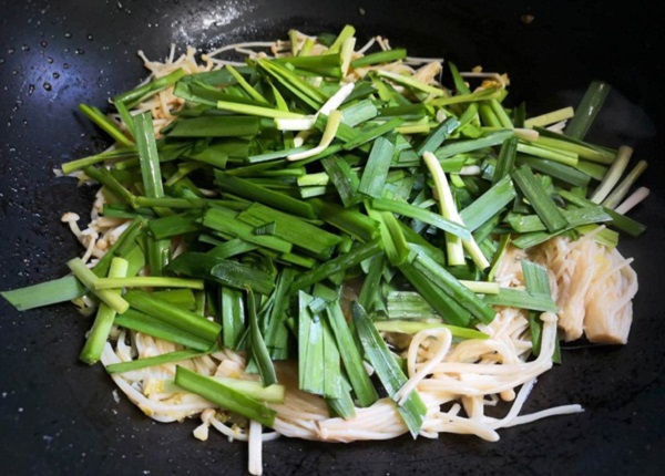 - Bước 4: Đổ ít dầu ăn vào chảo, cho nấm vào đảo đều. Sau đó, thêm hẹ vào đảo qua.