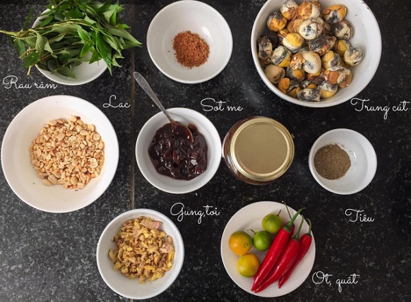 - Rau răm, ớt, hành củ,tỏi, gừng, nước mắm, đường, dầu ăn, bơ nhạt.