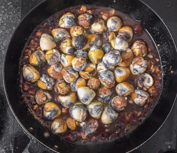 - Đun sôi hỗn hợp trên đến khi nước sốt hơi sền sệt thì đổ trứng cút vào, đảo đều trứng cút cho ngấm nước sốt. Múc ra đĩa rồi thưởng thức.