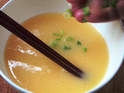 Trứng chín, bạn lấy ra, rưới thêm chút dầu vừng và rắc nốt số hành lá lên trên, dọn ăn nóng.