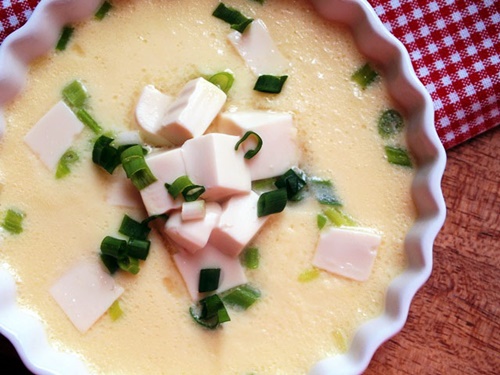 Món trứng hấp đậu phụ non là món ăn mới dựa trên những nguyên liệu thực phẩm quen thuộc. Món này ít chất béo, bổ dưỡng, ăn vào miệng mềm mại rất thích hợp cho trẻ em và người già hay người đang bị ốm yêu cầu thức ăn dễ tiêu, chống đầy bụng.