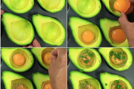 - Bước 2: Đặt bơ vào một vị trí cố định (như khuôn làm bánh muffin, khuôn bánh khọt, một cái chén,...), rồi đập trứng vào lòng của quả bơ. Sau đó, rắc lần lượt: Một ít muối, một ít tiêu và một ít hành lá lên trên cùng.