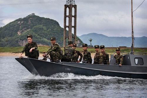 Binh sĩ Triều Tiên tuần tra trên sông Yalu sát biên giới với thành phố Dandong, Trung Quốc. |