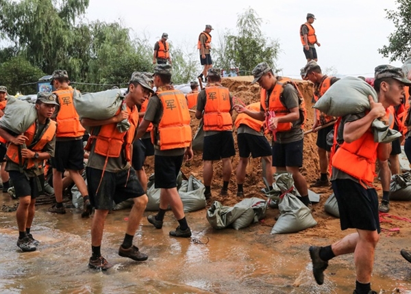 Quân nhân được huy động tham gia xây một con đê khẩn cấp ở hồ Boyang, Cửu Giang. |