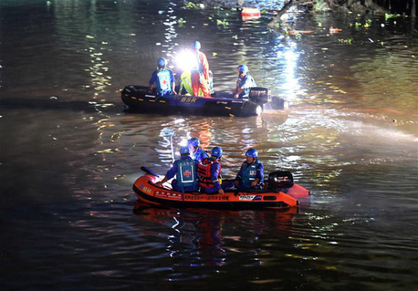 Lực lượng cứu hộ tìm kiếm người mất tích trên sông Đào Hoa . (Ảnh: Tân hoa xã) |