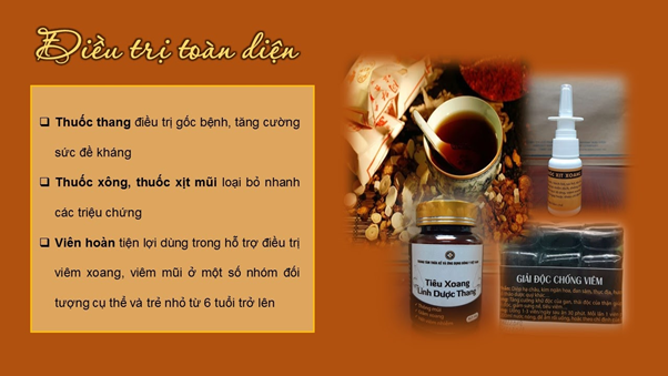 Điều trị triệu chứng: Triệt tiêu viêm nhiễm, thanh nhiệt giải độc, khu phong tán hàn, lưu thông khí huyết, loại bỏ ứ trệ ở vùng xoang.