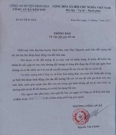 Trong thông báo do ông Chính ký nếu rõ: “Hiện nay, trên địa bàn huyện Định Hóa, tỉnh Thái Nguyên xuất hiện đối tượng bắt cóc trẻ em thủ đoạn hoạt động như sau: Có 02 đối tượng đi xe máy, mặt bịt khẩu trang đi trước để kiểm tra, thăm dò. Nếu gặp trẻ em trên đường, các đối tượng này sẽ dùng thủ đoạn dụ dỗ trẻ em nghe theo chúng. 01 chiếc xe ô tô con đi theo sau đối tượng bắt các trẻ em lên xe và chở đi."