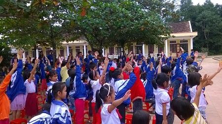 Các em học sinh hồ hởi trong buổi hoạt động ngoại khóa với đội SVTN. |