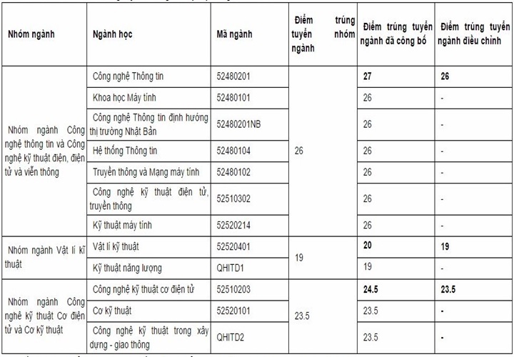 Cụ thể, điểm trúng tuyển của ngành Công nghệ thông tin giảm từ 27 thành 26, ngành Vật lý kỹ thuật từ 20 xuống 19 điểm và ngành Công nghệ kỹ thuật cơ điện tử giảm từ 24,5 xuống 23,5.