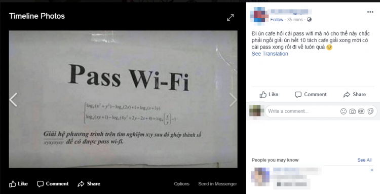 Đi kèm với bức ảnh chụp bài toán khó, nam thanh niên tâm sự: “Đi uống cafe hỏi cái pass wifi mà nó cho thế này chắc phải ngồi giải uống hết 10 tách cafe giải xong mới có cái pass xong rồi đi về luôn quá”.