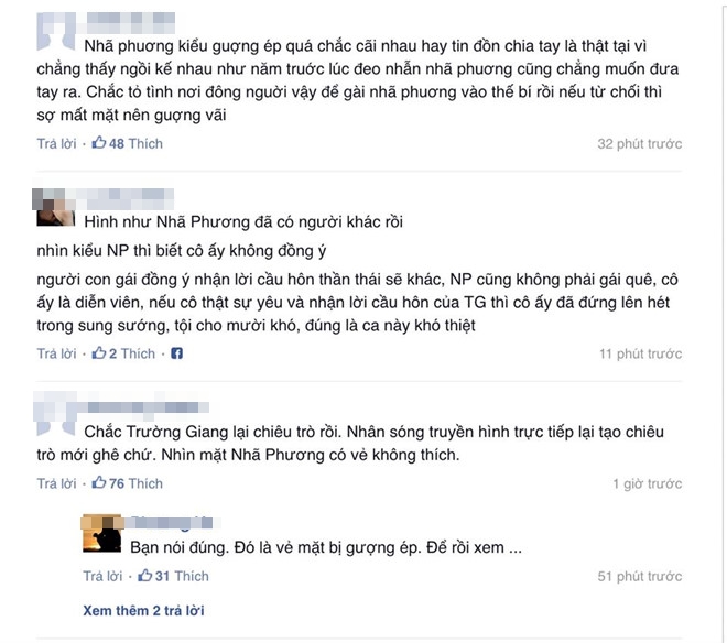 Một người dùng mạng có nickname Độc Chi cho rằng khoảnh khắc cầu hôn tối 18/1 “thực sự bất ổn”. Theo cô, Nhã Phương có vẻ khó chịu, không đồng ý trong khi Trường Giang vội vàng, hấp tấp như đang cố níu kéo mối quan hệ. Đồng quan điểm với đám đông, dân mạng tên Đinh Duyên tin rằng nếu thực sự hạnh phúc “Nhã Phương đã đứng dậy ôm lấy Trường Giang thay vì ngồi đó mặt đờ đẫn”.