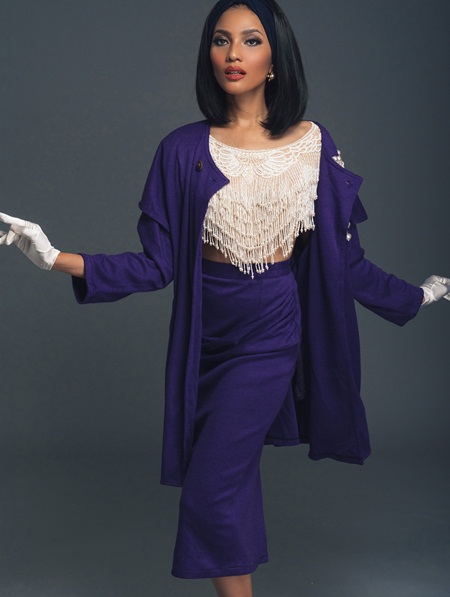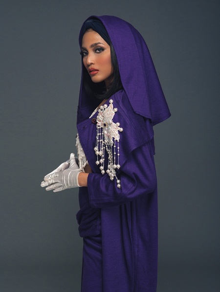 Điểm nhấn của bộ trang phục là chiếc áo khoác dài ôm dáng có họa tiết hoa nổi bật được điểm xuyến những viên ngọc trai đính kết một cách tỉ mỉ, cầu kỳ. Người đẹp cũng khéo léo tạo ra sự hài hòa khi cài chiếc băng đô và sử dụng tấm vải mỏng phủ đầu tone-sur-tone, tạo sự hài hòa và thống nhất xuyên suốt của bộ trang phục.