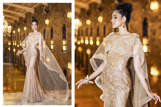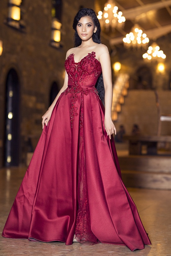 Trương Thị May diện những bộ váy dạ hội lộng lẫy được thiết kế theo dạng đầm đuôi cá, ôm sát và giúp khoe khéo những đường cong cơ thể.