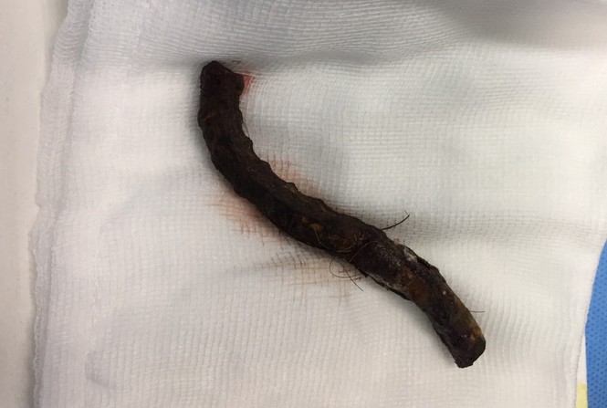 Các bác sĩ tiến hành phẫu thuật cấp cứu lấy dị vật cho bệnh nhân. Sau 2 giờ 40 phút phẫu thuật cho bệnh nhân, các bác sĩ đã lấy thành công thanh sắt dài khoảng 10cm cắm vào mô não, xung quanh có nhiều dịch kèm xuất huyết dưới màng cứng.