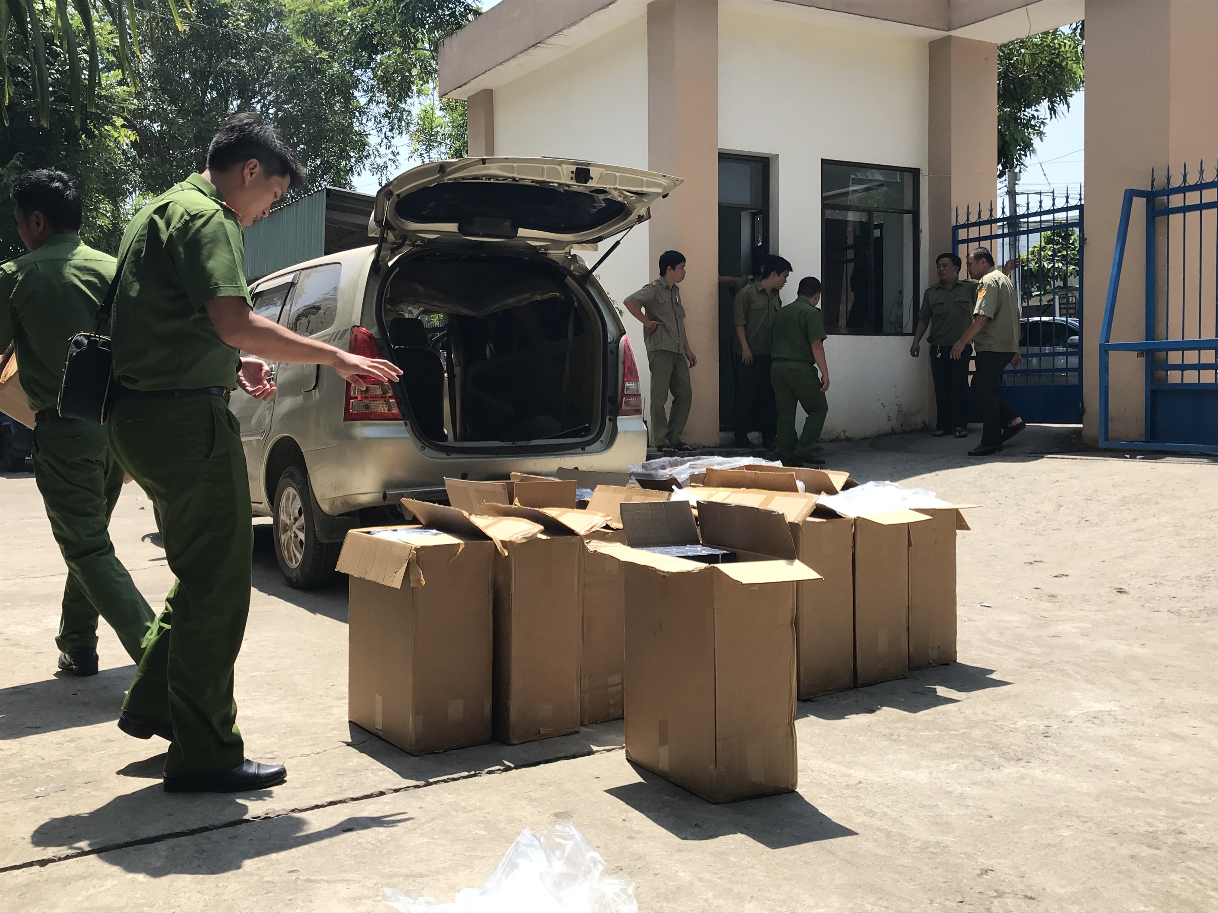 Qua công tác khám nghiệm, lực lượng chức năng phát hiện bên trong xe chứa khoảng hơn 10 thùng giấy loại lớn, mở các thùng ra thì bên trong chứa nhiều cây thuốc hiệu 555. Sau đó, tất cả được mang ra kiểm đếm cẩn thận và niêm phong, lập biên bản để phục vụ công tác điều tra.
