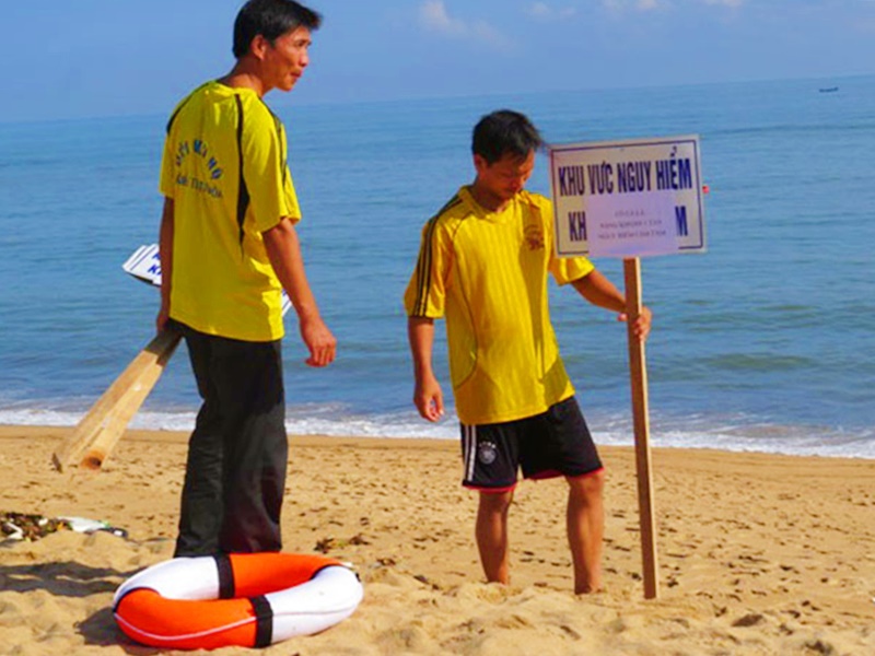 Lực lượng cứu hộ cắm biển cảnh báo người dân. |