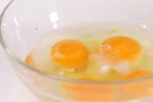 Trứng đập ra bát, cho muối đường vào đánh tan lòng đỏ.
